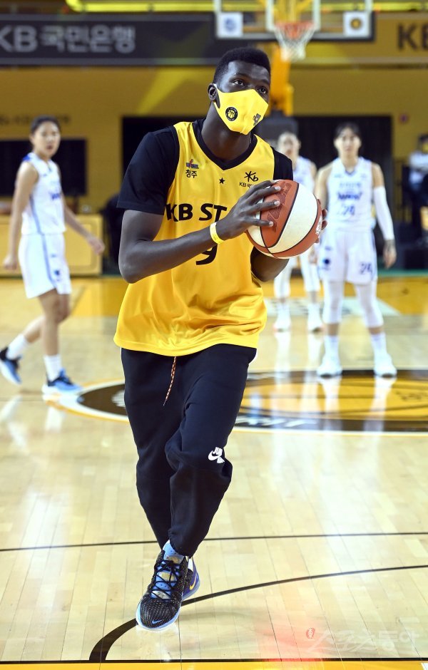 26일 청주체육관에서 열린 ‘삼성생명 2021-22 여자프로농구’는 ‘ KB스타즈와 우리은행 경기에서 시투자로 나선 프로배구 KB손해보험 케이타가 덩크슛을 하고 있다.