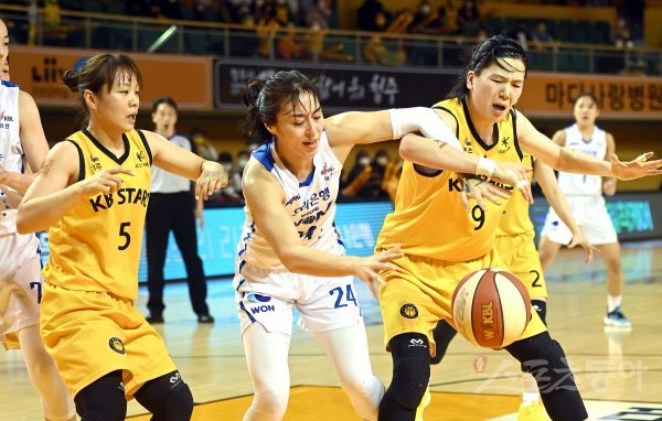 26일 청주체육관에서 열린 ‘삼성생명 2021-22 여자프로농구’는 ‘ KB스타즈와 우리은행 경기에서 KB스타즈 김소담과 우리은행 김소니아가 리바운드 볼을 다투고 있다.