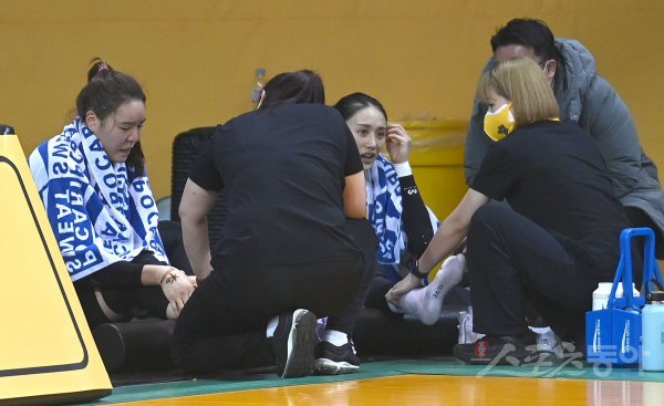 26일 청주체육관에서 열린 ‘삼성생명 2021-22 여자프로농구’는 ‘ KB스타즈와 우리은행 경기에서 KB스타즈 박지수와 강이슬이 나란히 부상으로 교체되어 치료를 받고 있다.