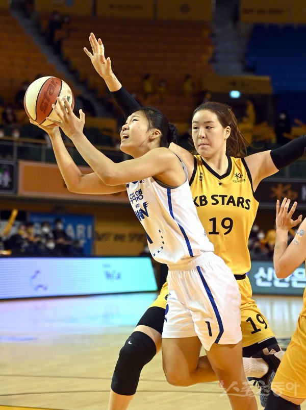 26일 청주체육관에서 열린 ‘삼성생명 2021-22 여자프로농구’는 ‘ KB스타즈와 우리은행 경기에서 우리은행 박지현이 KB스타즈 박지수의 수비를 뚫고 골밑 슛을 하고 있다.
