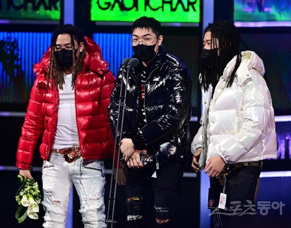 그룹 호미들이 27일 서울 송파구 잠실실내체육관에서 열린 ‘제11회 가온차트 뮤직 어워즈’ 올해의 발견 힙합상을 수상해 소감을 말하고 있다.