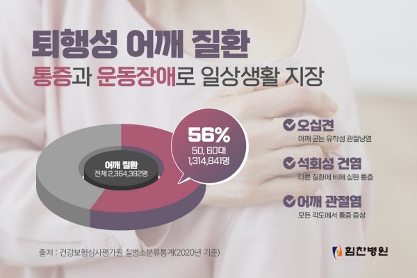 건강보험심사평가원 자료에 따르면 2020년 기준 연령대별 다빈도질병순위로 어깨 병변이 50대기 3위, 60대는 5위를 차지했다. 환자수도 5~60대 환자가 131만4841명으로 전체의 56%에 달한다.