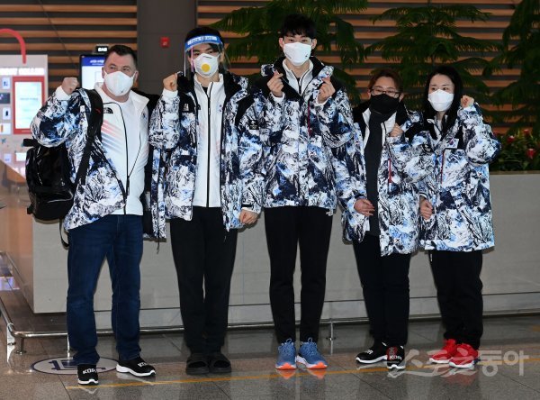 ‘2022 베이징 동계올림픽’에 출전하는 남자피겨스케이팅 국가대표팀이 3일 인천국제공항을 통해 출국에 앞서 기념촬영을 하고 있다.