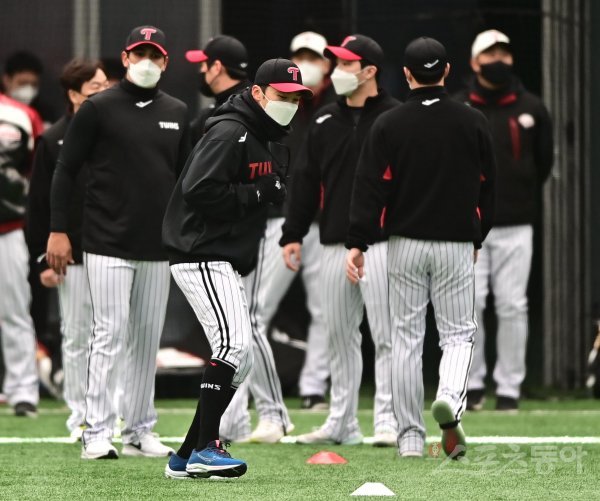 3일 경기도 이천 LG챔피언스파크에서 열린 LG 트윈스의 2022시즌 첫 스프링캠프에서 LG 박해민이 워밍업을 하고 있다.