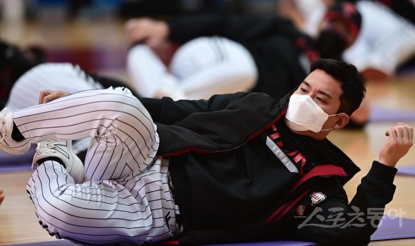 3일 경기도 이천 LG챔피언스파크에서 열린 LG 트윈스의 2022시즌 첫 스프링캠프에서 LG 김민성이 스트레칭으로 워밍업을 하고 있다.