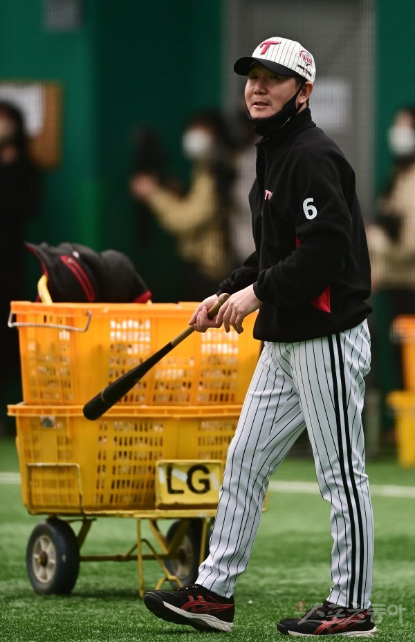 3일 경기도 이천 LG챔피언스파크에서 열린 LG 트윈스의 2022시즌 첫 스프링캠프에서 LG 류지현 감독이 선수들의 펑고 훈련을 돕고 있다.