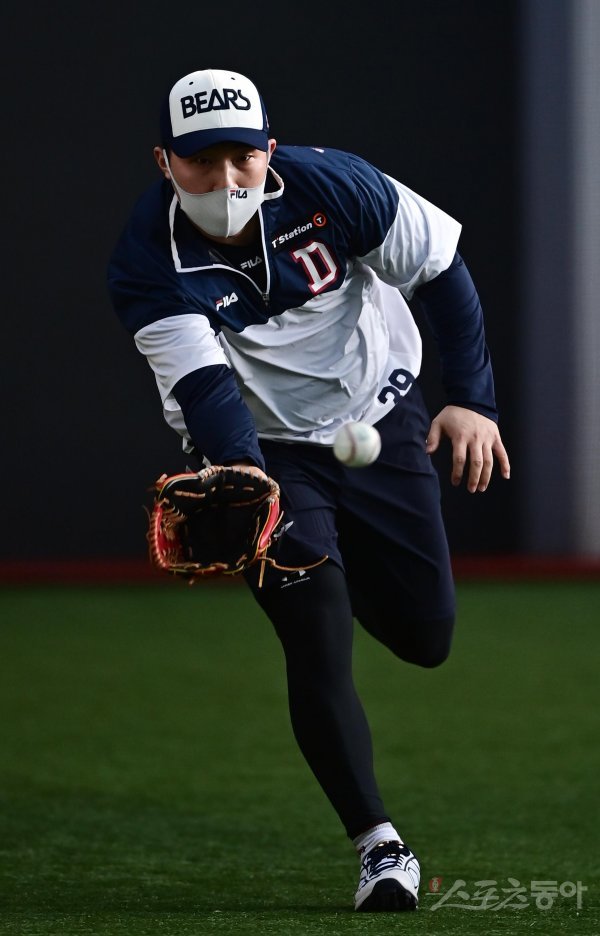 6일 경기도 이천 두산베어스파크에서 열린 두산 베어스의 2022 스프링캠프에서 두산 김인태가 수비 훈련을 하고 있다.