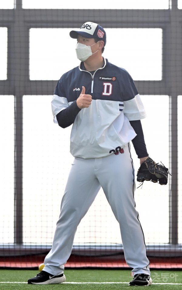 6일 경기도 이천 두산베어스파크에서 열린 두산 베어스의 2022 스프링캠프에서 두산 권휘가 동료에게 엄지를 치켜세우고 있다.