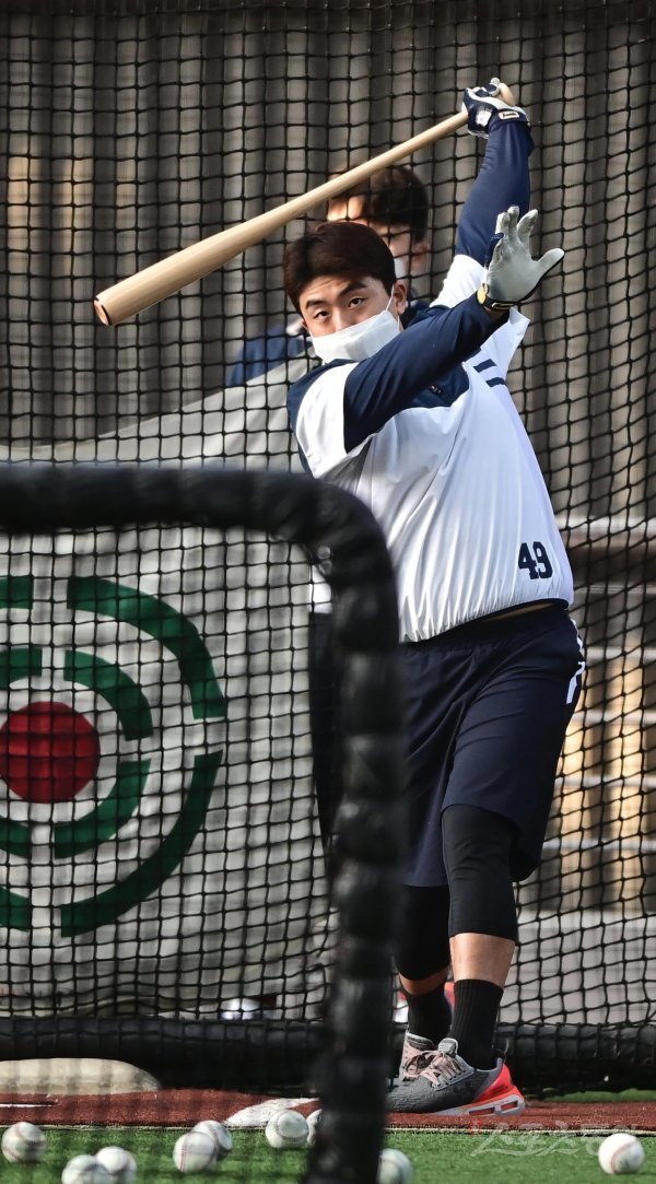 6일 경기도 이천 두산베어스파크에서 열린 두산 베어스의 2022 스프링캠프에서 두산 강진성이 타격 훈련을 하고 있다.