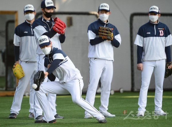 6일 경기도 이천 두산베어스파크에서 열린 두산 베어스의 2022 스프링캠프에서 두산 박신지가 수비 훈련을 하고 있다.