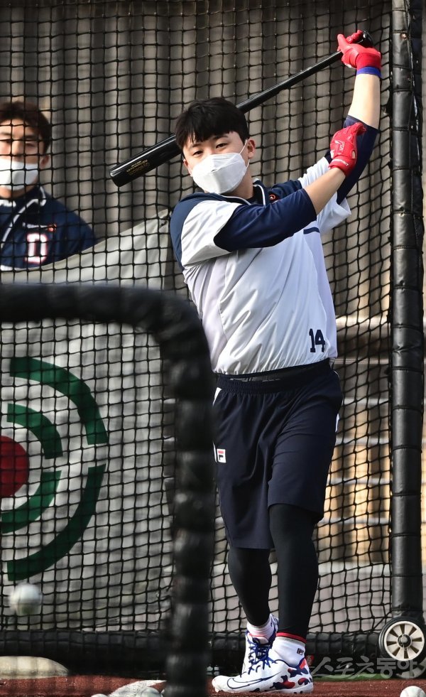 6일 경기도 이천 두산베어스파크에서 열린 두산 베어스의 2022 스프링캠프에서 두산 박계범이 타격 훈련을 하고 있다.