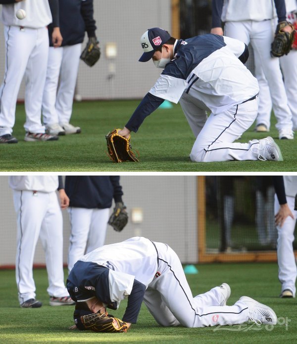 6일 경기도 이천 두산베어스파크에서 열린 두산 베어스의 2022 스프링캠프에서 두산 유재유가 수비 훈련에서 나온 실수에 아쉬워하고 있다.