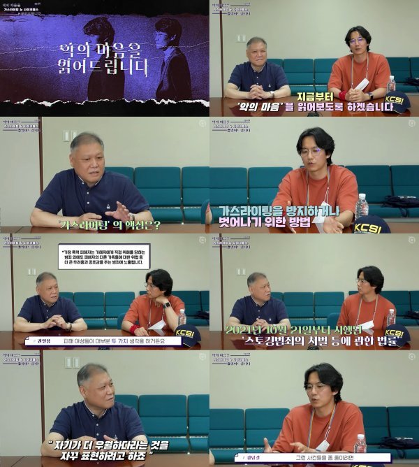 가스라이팅(타인의 심리나 상황을 조작해 자기 자신을 의심하게 함으로써 그 사람에게 지배력을 행사하고 통제하는 것)의 정의를 알아본 두 사람은 좀 더 심층적인 대화를 나눴다. 특히 가스라이팅 방지 방법과 가해자와 피해자의 심리를 하나하나 짚는 김남길과 권일용 교수의 이야기는 흥미를 돋우며 한시도 눈을 뗄 수 없게 했다.