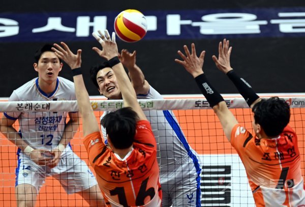 6일 경기도 안산 상록수체육관에서 ‘2021-2022 도드람 V리그’ 안산 OK저축은행과 대전 삼성화재의 남자부 경기가 열렸다. 삼성화재 홍민기가 OK저축은행 블로커를 피해 스파이크를 날리고 있다.