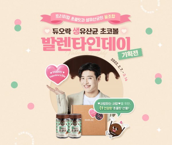 마이크로바이옴 기업 쎌바이오텍은 듀오락 생유산균 초코볼의 밸런타인데이 기획전을 진행한다.3월14일까지 듀오락몰에서 듀오락 생유산균 초코볼 세트를 할인한다.