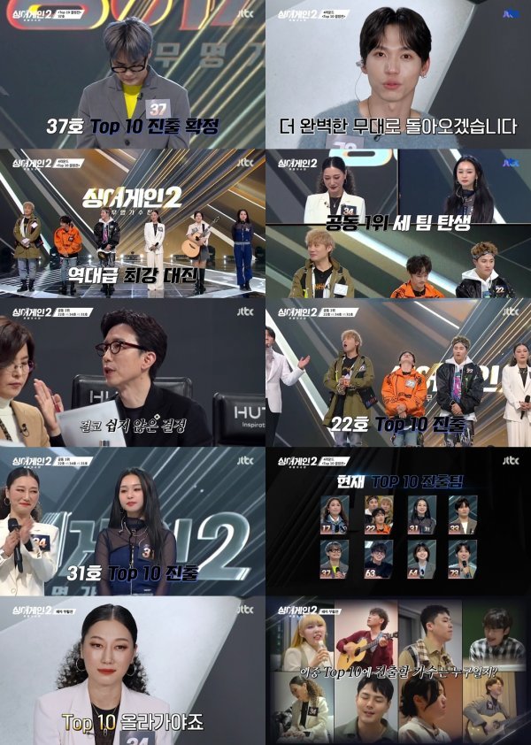 앞서 ‘페스티벌 최강자’ 63호, ‘가정식 로커’ 17호, ‘허스키 보이스’ 33호, ‘7080 감성’ 64호에 이어 이날 ‘보컬 타짜’ 37호, ‘음색 깡패’ 73호, ‘오디션 최강자’ 22호, ‘파란 마녀’ 31호 등 총 8팀이 먼저 Top10에 입성했다.