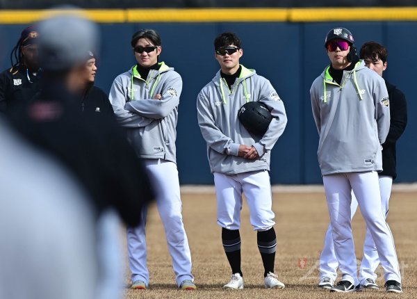 8일 부산 기장현대차드림볼파크에서 열린 KT 위즈의 2022 스프링캠프에서 KT 김민혁, 배정대가 내야진의 수비 훈련을 지켜보고 있다.