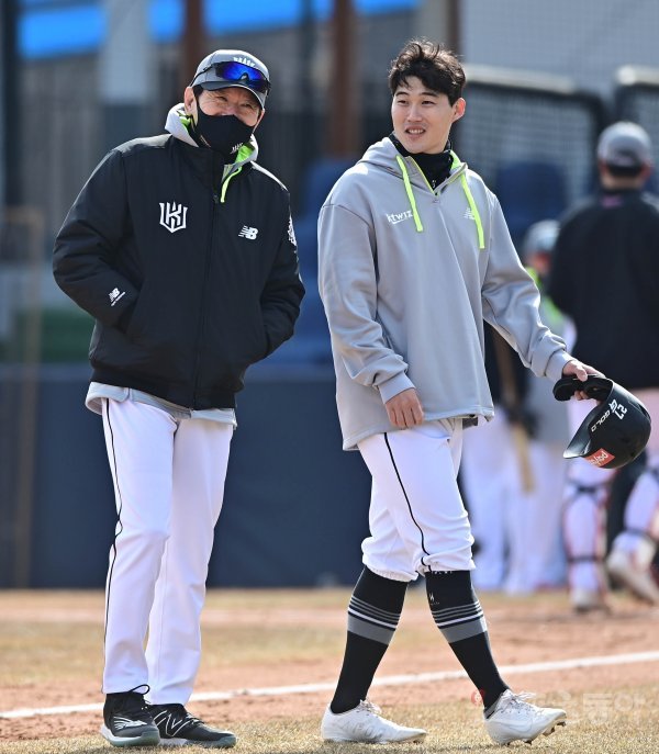 8일 부산 기장현대차드림볼파크에서 열린 KT 위즈의 2022 스프링캠프에서 KT 이강철 감독이 배정대와 이야기하고 있다.