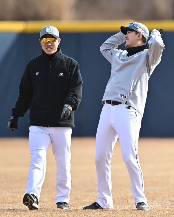 8일 부산 기장현대차드림볼파크에서 열린 KT 위즈의 2022 스프링캠프에서 KT 고영표(오른쪽)가 신본기와 이야기를 하고 있다.