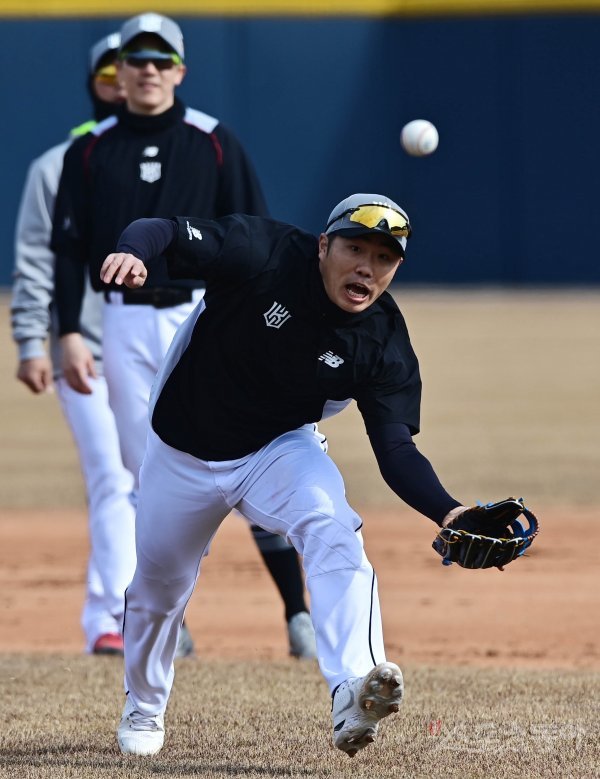 8일 부산 기장현대차드림볼파크에서 열린 KT 위즈의 2022 스프링캠프에서 KT 신본기가 수비 훈련을 하고 있다.