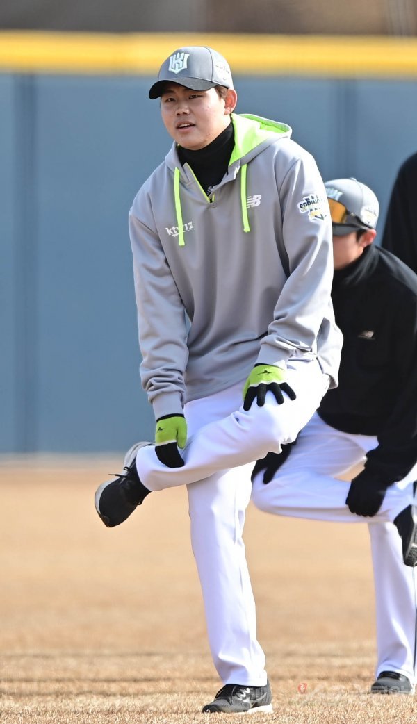 8일 부산 기장현대차드림볼파크에서 열린 KT 위즈의 2022 스프링캠프에서 KT 소형준이 워밍업을 하고 있다.