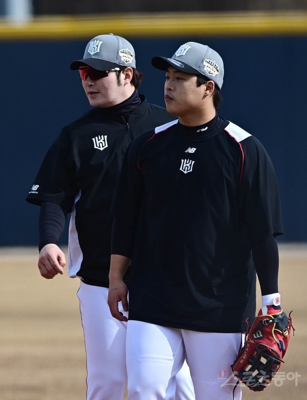 8일 부산 기장현대차드림볼파크에서 열린 KT 위즈의 2022 스프링캠프에서 KT 박병호와 강백호가 수비 훈련을 하고 있다. 기장 | 주현희 기자 teth1147@donga.com