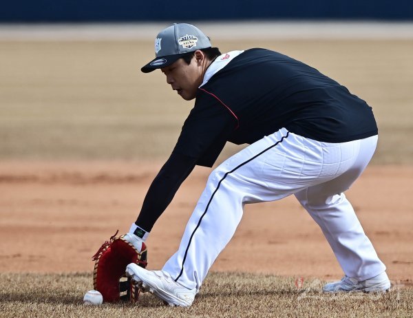 8일 부산 기장현대차드림볼파크에서 열린 KT 위즈의 2022 스프링캠프에서 KT 강백호가 수비 훈련을 하고 있다.
