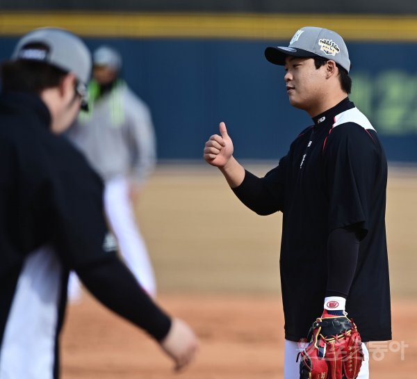 8일 부산 기장현대차드림볼파크에서 열린 KT 위즈의 2022 스프링캠프에서 KT 강백호가 박병호의 수비에 엄지를 치켜세우고 있다.