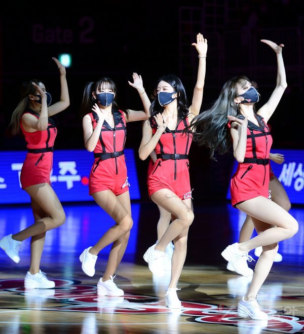 8일 경기도 수원 칠보체육관에서 열린 ‘2021-2022 정관장 프로농구’ 수원 kt와 원주 DB의 경기에서 kt 치어리더가 화려한 공연을 선보이고 있다.