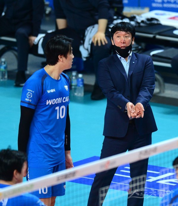 8일 서울 장충체육관에서 열린 ‘2021~2022 도드람 V-리그’ 남자부 우리카드와 한국전력 경기에서 우리카드 신영철 감독이 나경복에게 수비 자세를 보이며 이야기하고 있다.