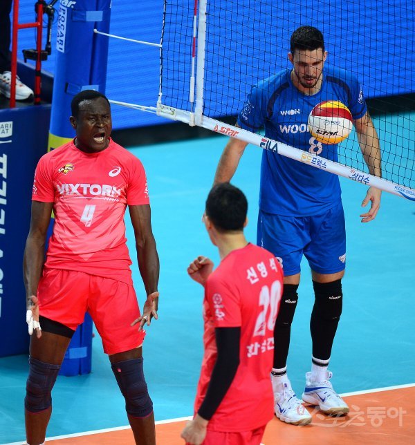 8일 서울 장충체육관에서 열린 ‘2021~2022 도드람 V-리그’ 남자부 우리카드와 한국전력 경기에서 한국전력 다우디가 블로킹 득점에 성공한 후 기뻐하고 있다.
