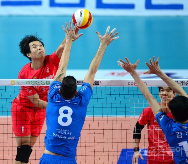 8일 서울 장충체육관에서 열린 ‘2021~2022 도드람 V-리그’ 남자부 우리카드와 한국전력 경기에서 한국전력 서재덕이 우리카드의 블로킹 사이로 스파이크를 날리고 있다.
