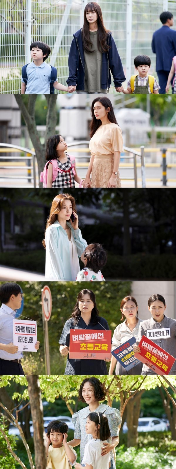 또한 편안한 차림새지만 타고난 우아함이 흐르는 서진하(김규리 분), ‘벼랑 끝에 선 초등교육’이라는 판넬을 들고 시위에 나선 자칭 깨어있는 엄마 김영미(장혜진 분), 두 아이를 품에 안고 발랄한 웃음을 짓고 있는 이은표의 사촌동생 박윤주(주민경 분)의 모습도 눈길을 끌고 있다.