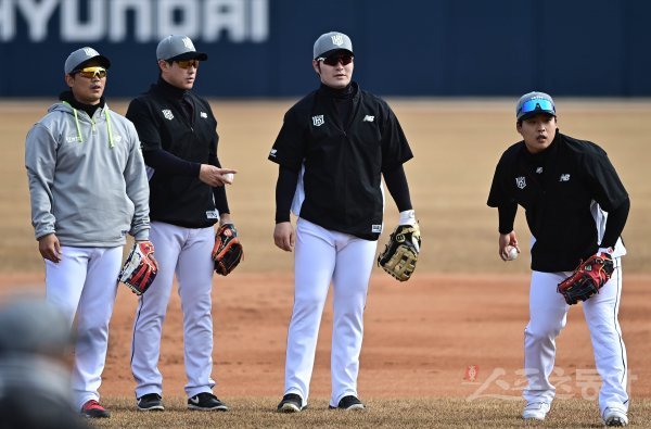 9일 부산 기장현대차드림볼파크에서 열린 KT 위즈의 2022 스프링캠프에서 KT 박경수, 황재균, 박병호, 강백호가 수비 훈련 도중 장난을 치고 있다.