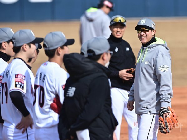 9일 부산 기장현대차드림볼파크에서 열린 KT 위즈의 2022 스프링캠프에서 KT 황재균이 수비 훈련에서 동료를 보며 웃고 있다.
