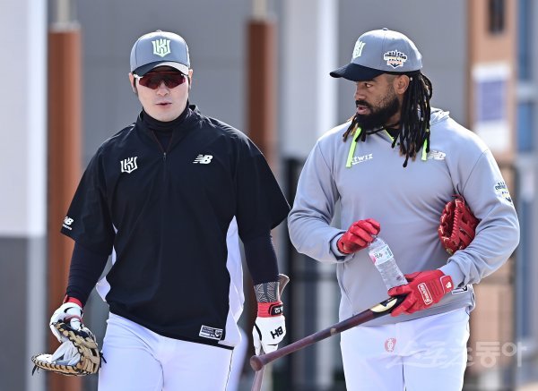 9일 부산 기장현대차드림볼파크에서 열린 KT 위즈의 2022 스프링캠프에서 KT 박병호와 라모스가 타격 훈련을 마친 뒤 이야기를 하고 있다.