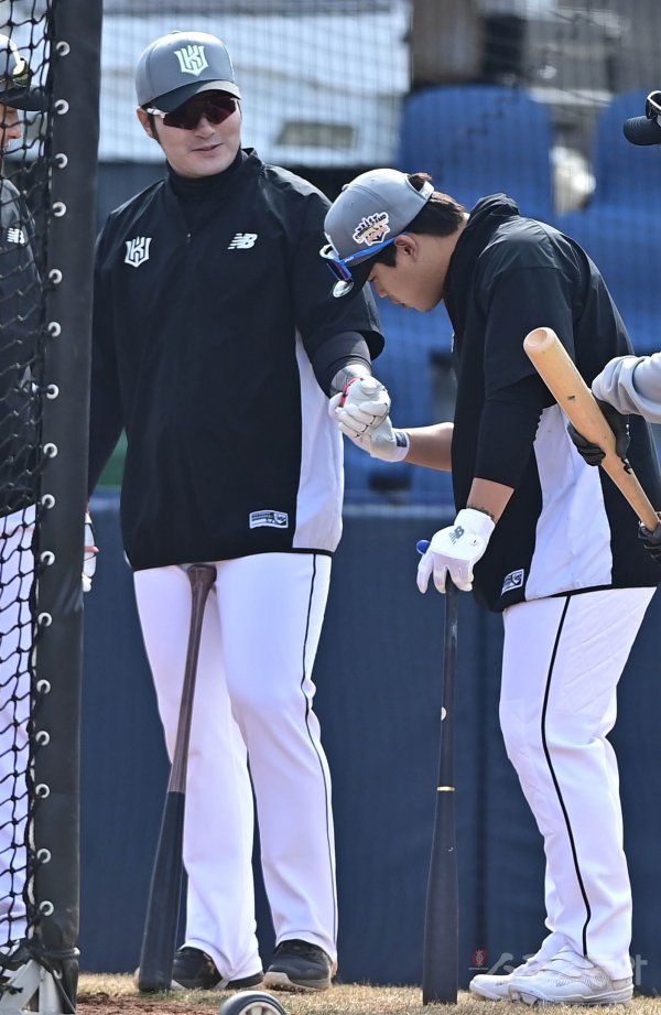 9일 부산 기장현대차드림볼파크에서 열린 KT 위즈의 2022 스프링캠프에서 KT 강백호가 박병호의 타투를 보고 있다.