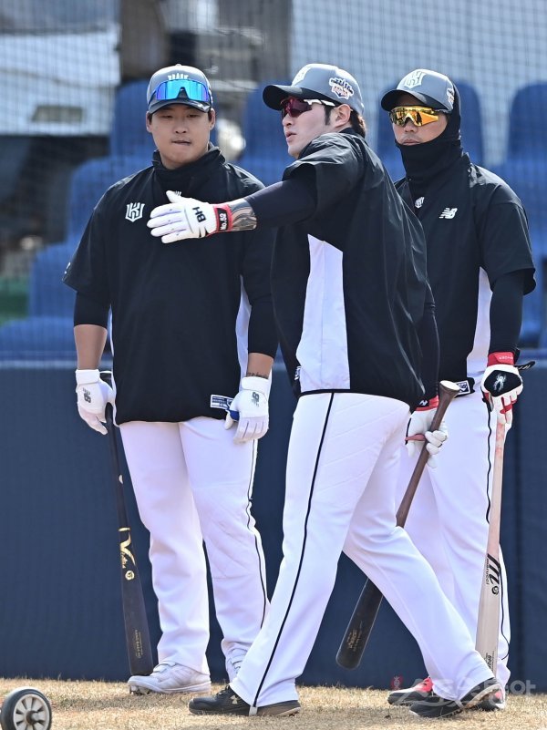 9일 부산 기장현대차드림볼파크에서 열린 KT 위즈의 2022 스프링캠프에서 KT 박병호가 강백호, 박경수와 이야기를 하고 있다.
