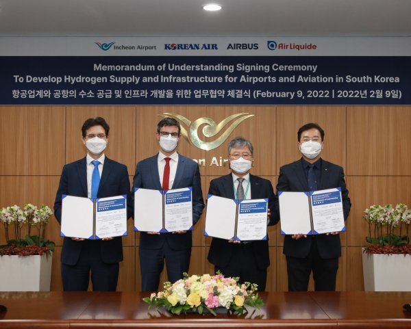 대한항공은 9일 인천국제공항공사 사옥에서 인천국제공항공사, 에어버스 코리아, 에어리퀴드 코리아와 항공업계와 공항의 수소 공급 및 인프라 개발을 위한 업무협약을 맺었다.