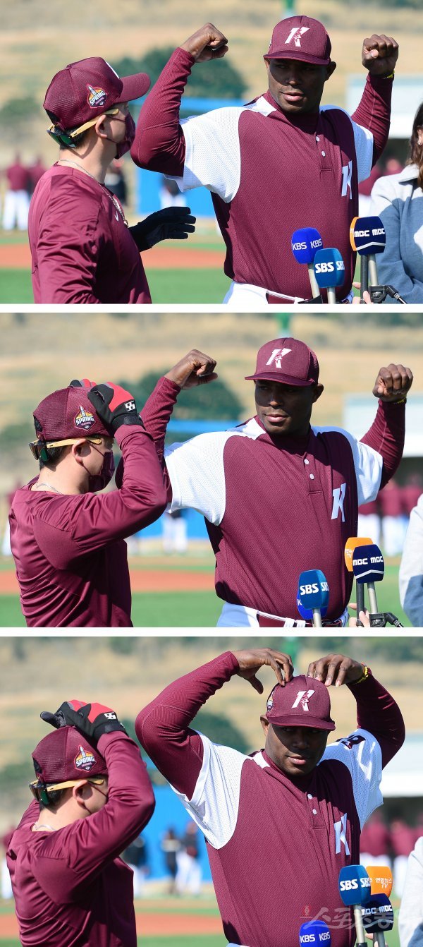 10일 전남 고흥거금야구장에서 열린 키움 히어로즈의 2022 스프링캠프에서 키움 푸이그가 방송사 인터뷰를 마치고 포즈를 취하고 있다.