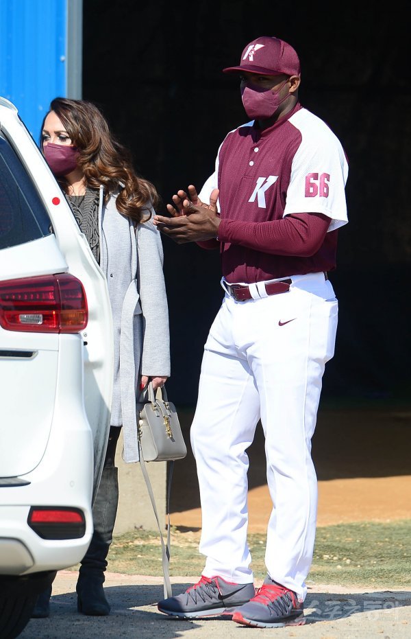 10일 전남 고흥거금야구장에서 열린 키움 히어로즈의 2022 스프링캠프에서 키움 푸이그가 차에서 내리고 있다.
