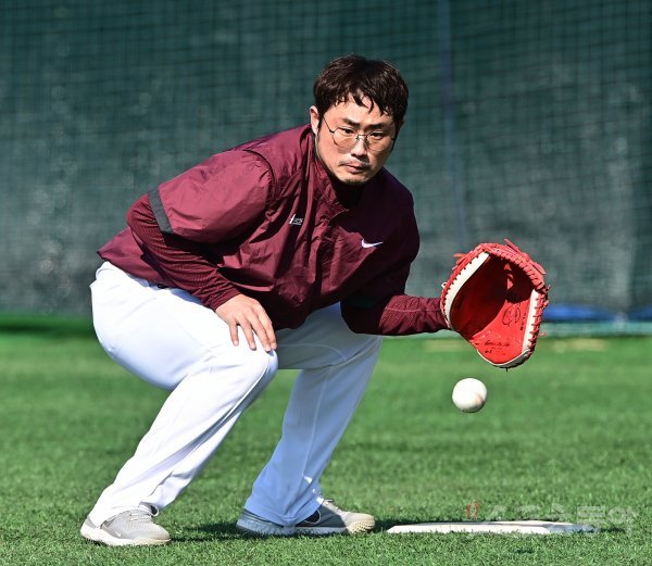 10일 전남 고흥거금야구장에서 열린 키움 히어로즈의 2022 스프링캠프에서 키움 이지영이 포구 훈련을 하고 있다.