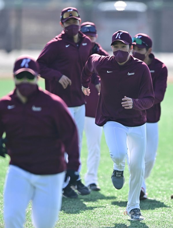 10일 전남 고흥거금야구장에서 열린 키움 히어로즈의 2022 스프링캠프에서 키움 안우진이 워밍업을 하고 있다.