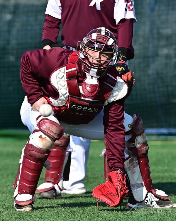 10일 전남 고흥거금야구장에서 열린 키움 히어로즈의 2022 스프링캠프에서 키움 박동원이 포구 훈련을 하고 있다.