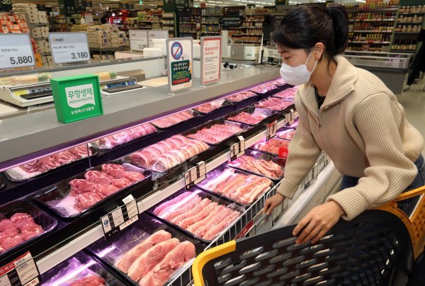 이마트 무항생제 돈육 매장에서 제품을 고르는 고객. 사진제공 l 이마트