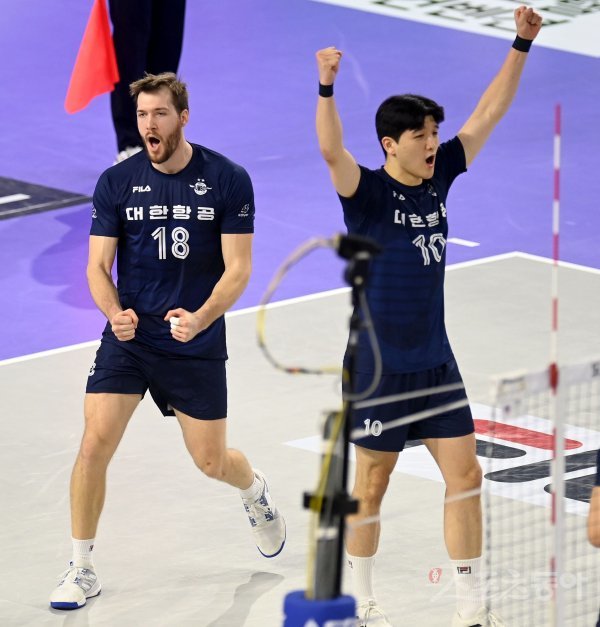 10일 인천 계양체육관에서 열린 ‘2021~2022 도드람 V-리그’ 남자부 대한항공과 OK금융그룹 경기에서 대한항공 링컨이 서브 득점에 성공한 후 기뻐하고 있다.