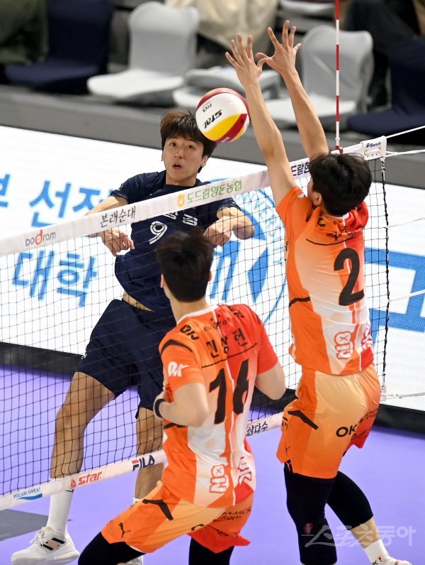 10일 인천 계양체육관에서 열린 ‘2021~2022 도드람 V-리그’ 남자부 대한항공과 OK금융그룹 경기에서 대한항공 곽승석이 OK금융그룹의 블로킹 사이로 밀어넣기 공격을 하고 있다.