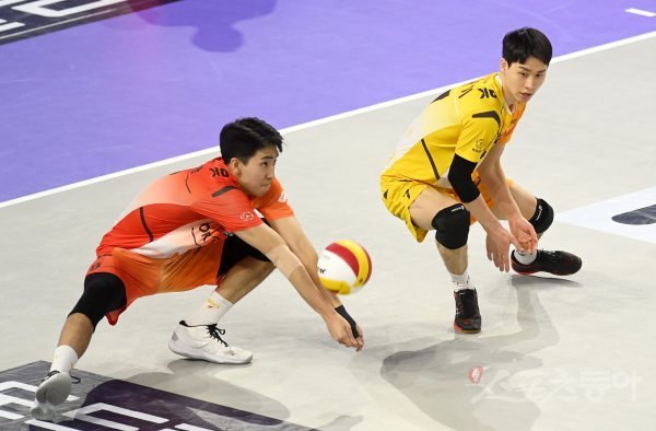 10일 인천 계양체육관에서 열린 ‘2021~2022 도드람 V-리그’ 남자부 대한항공과 OK금융그룹 경기에서 OK금융그릅 차지환이 리시브를 하고 있다.