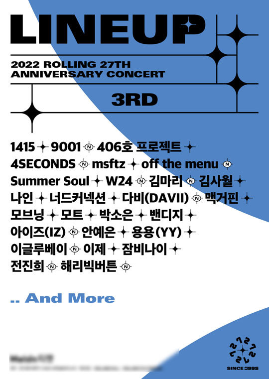 그 가운데 지난 10일 롤링홀 공식 SNS를 통해 공개된 3차 라인업에 ‘W24’ ‘이글루베이’ ‘9001’ ‘해리빅버튼’ ’오프더메뉴’ ‘포세컨즈(4SECONDS)’ ‘다비(DAVII)’ \'아이즈(IZ)\' ‘전진희’ ‘김마리’가 이름을 올렸다.