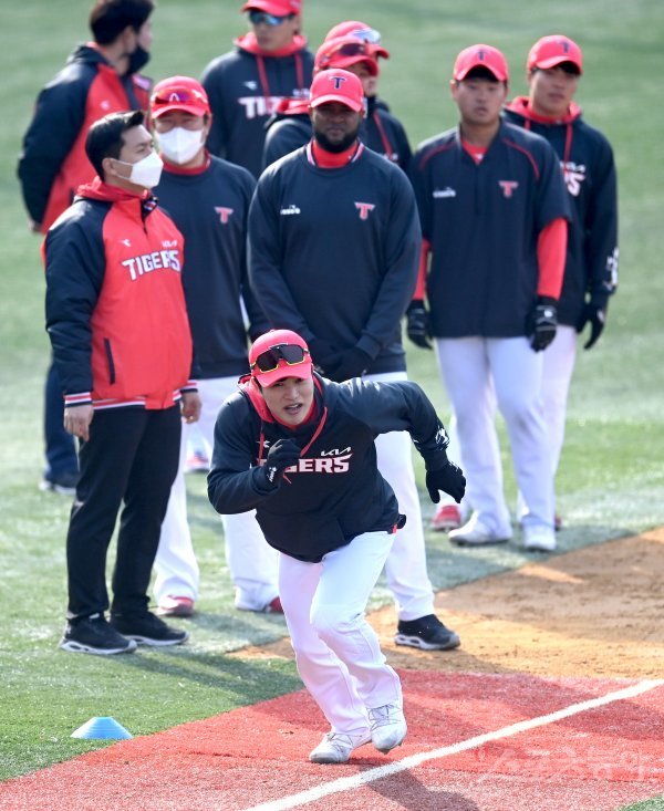 KIA 타이거즈가 13일 전남 함평 기아챌린저스필드에서 2022 스프링캠프를 가졌다. 김민식이 주루 훈련을 하고 있다.